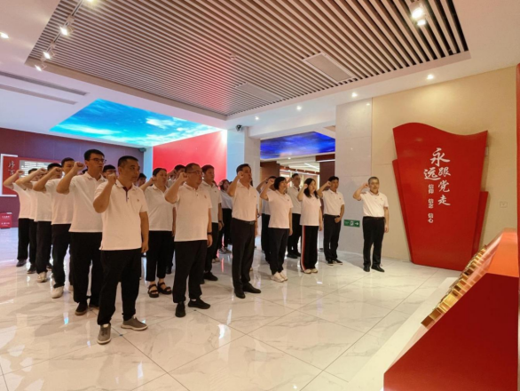 在教育基地內(nèi),全體黨員面對鮮紅黨旗,舉起右拳,重溫入黨誓詞,一字一句回顧錚錚誓言。